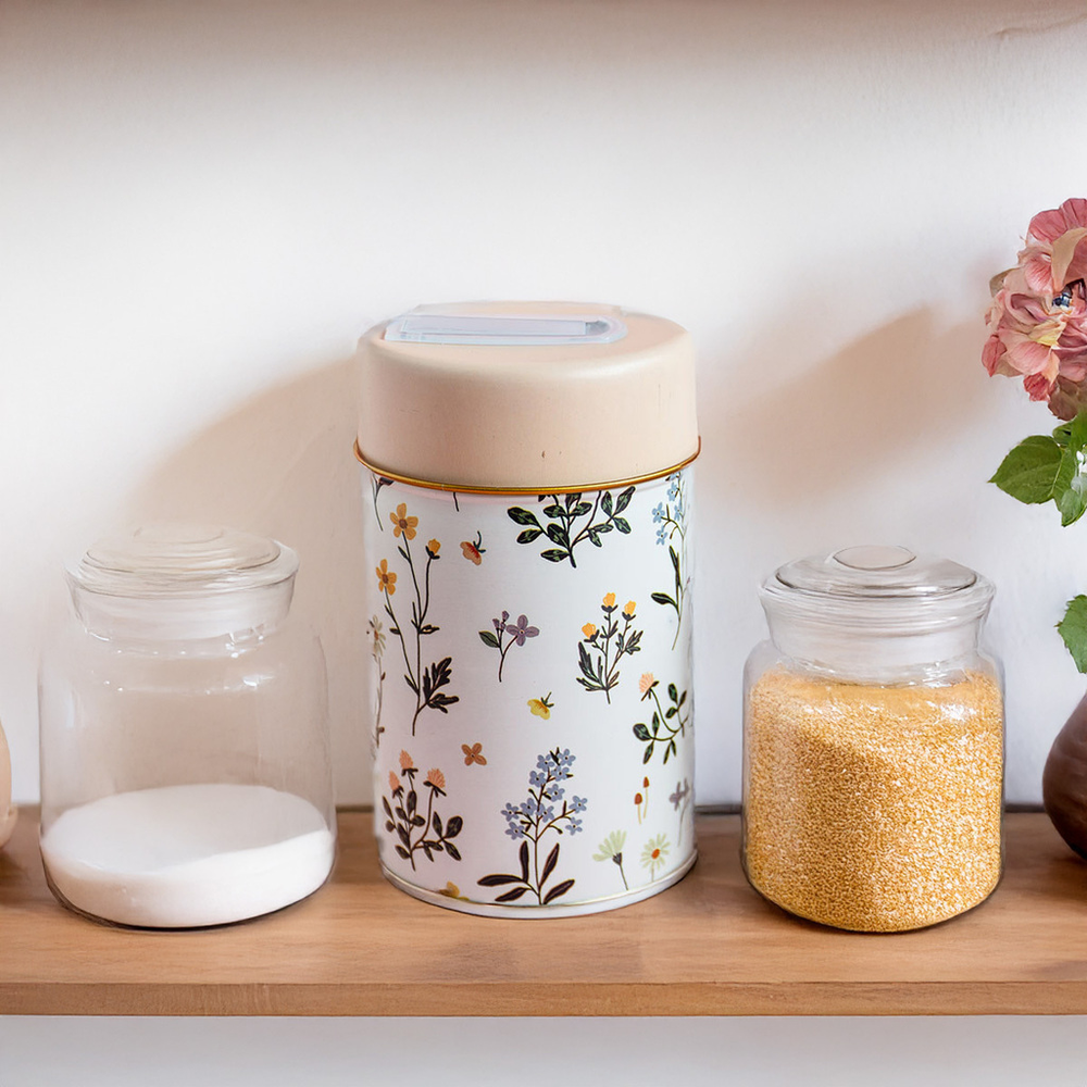Yerbera de hojalata con pico vertedor plástico, práctica para contener yerba/azúcar u otros alimentos. Útil para el hogar como objeto decorativo y llevarla con vos al picnic, paseo o viaje.