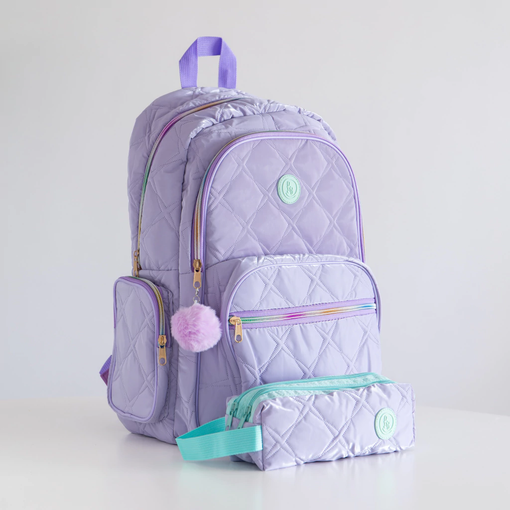 Cartuchera con cierre doble en matelassé engomado y plastisol. Tiene correa.