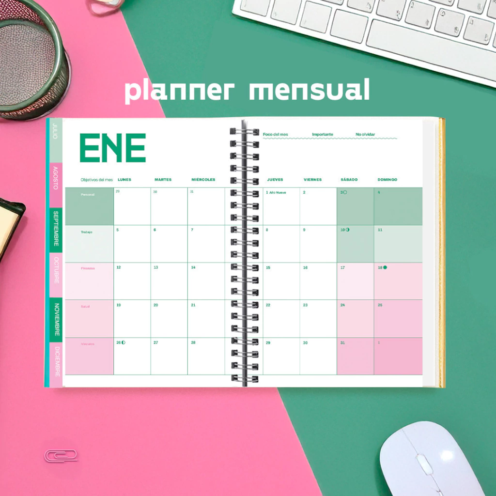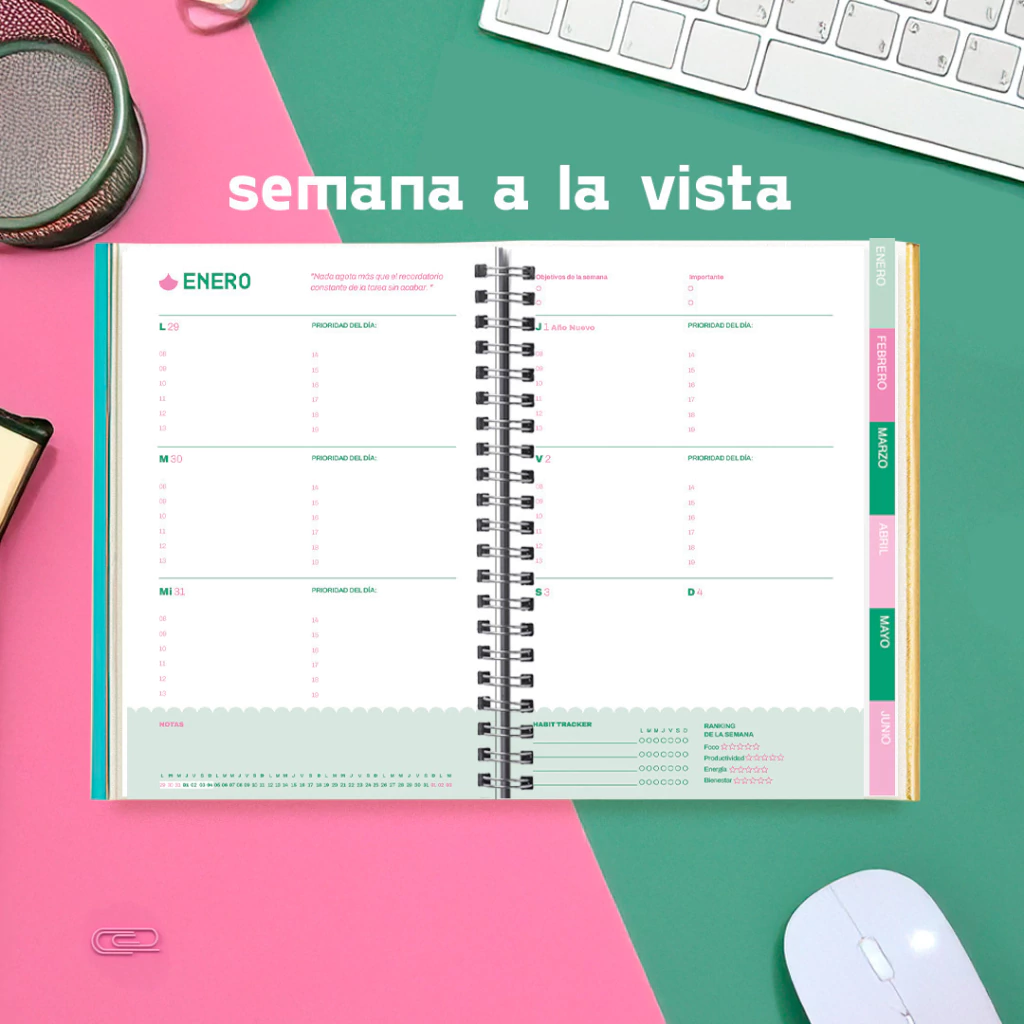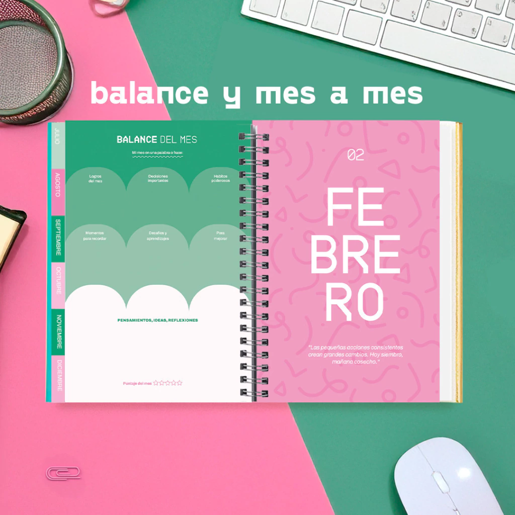 La agenda Chimi Productividad 2026, ha sido cuidadosamente diseñada pensando en todas tus necesidades.,no solo es funcional, sino que también está llena de inspiración y mensajes positivos que te animarán a seguir adelante. Con frases motivadoras y ejercicios de reflexión, te ayudará a mantenerte enfocada y comprometida con tus sueños y aspiraciones.