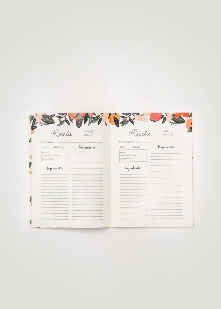 Viene con 38 páginas para anotar recetas y una página al final con las referencias para cantidades.