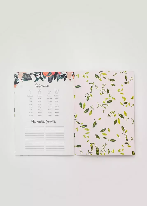 Viene con 38 páginas para anotar recetas y una página al final con las referencias para cantidades.