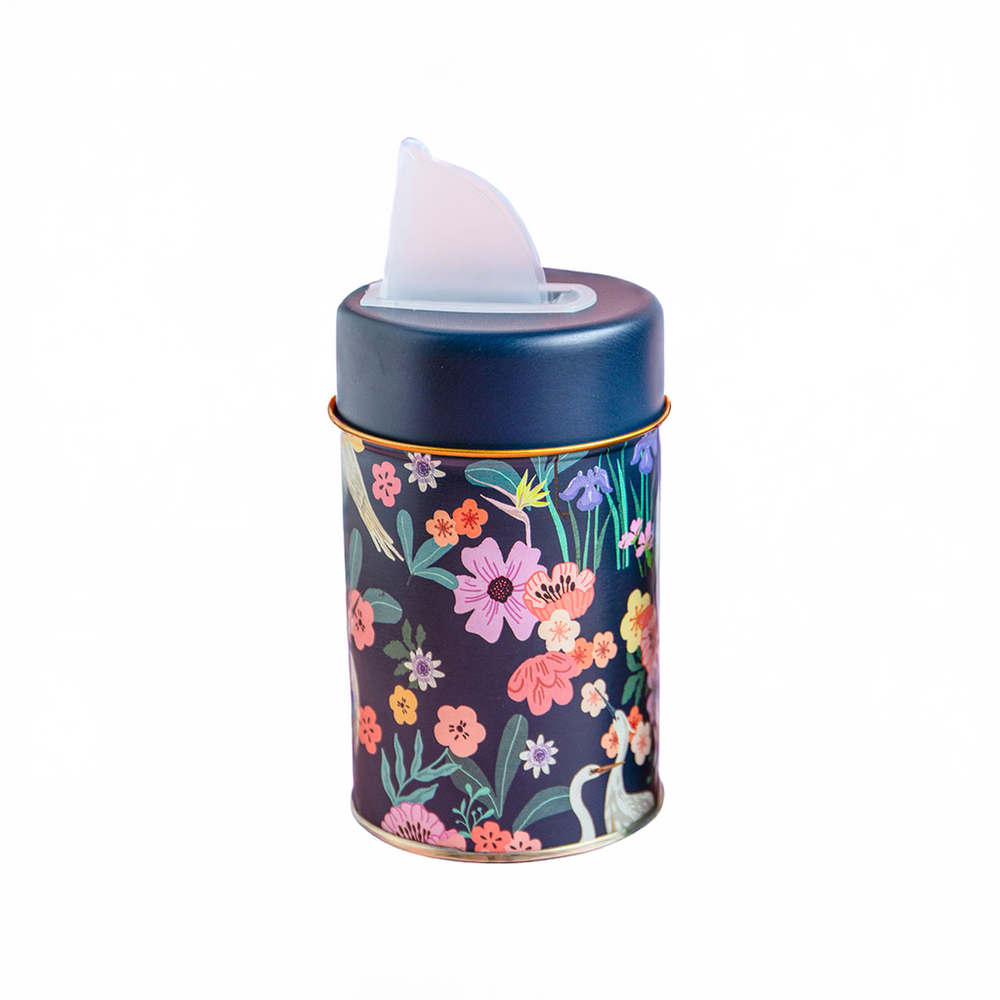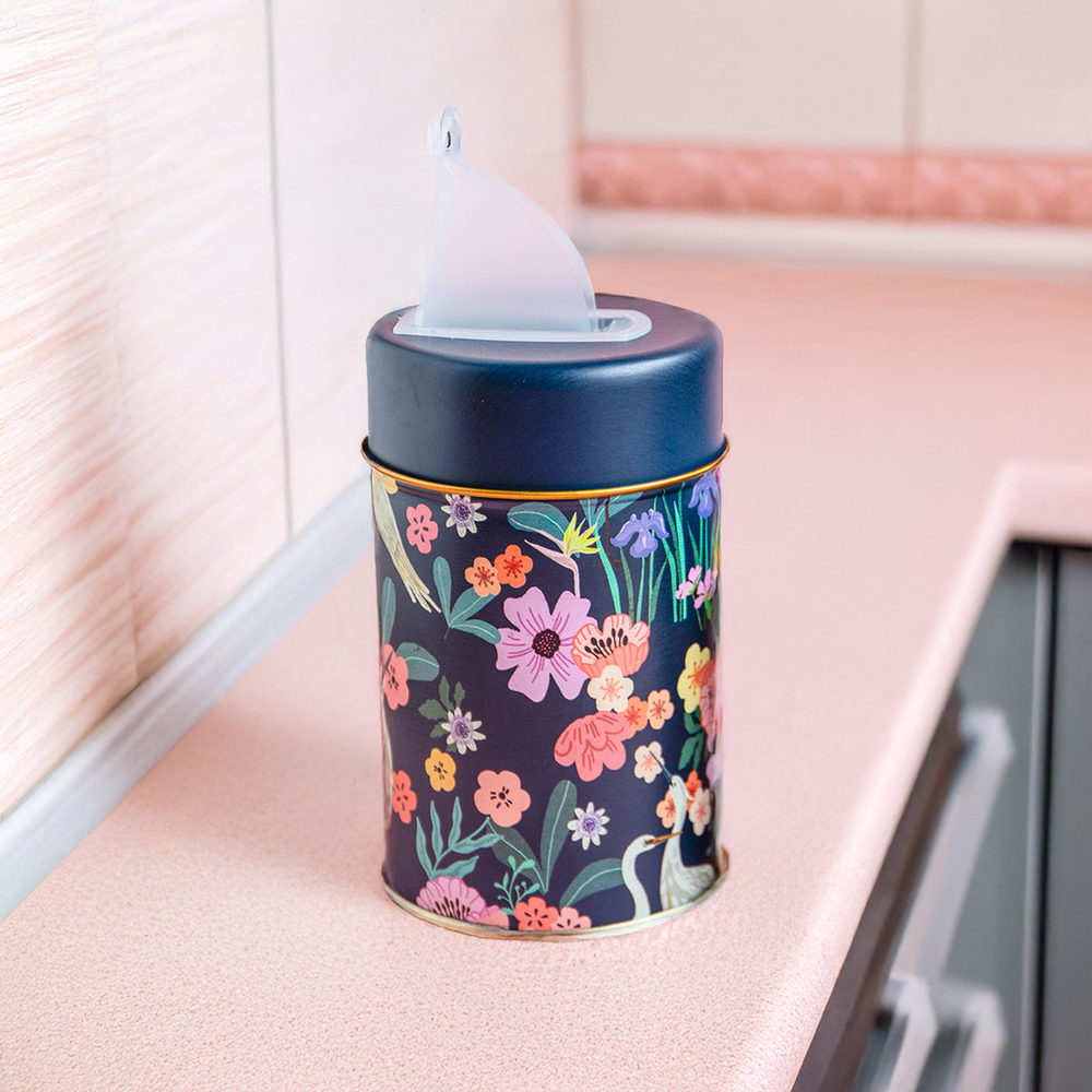 Yerbera de hojalata con pico vertedor plástico, práctica para contener yerba/azúcar u otros alimentos. Útil para el hogar como objeto decorativo y llevarla con vos al picnic, paseo o viaje.