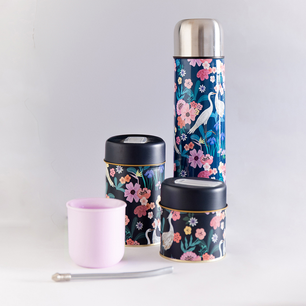 Set matero Magnolias, incluye: . Yerbera y azucarera flores silvestres, . Mate térmico lila con bombilla . Termo de 1 litro de acero inoxidable, con vinilo a tono.