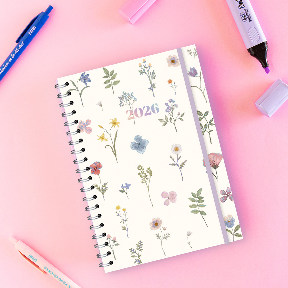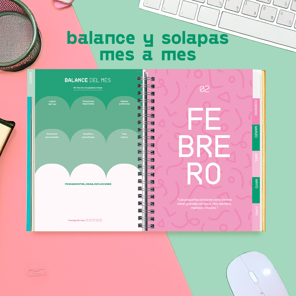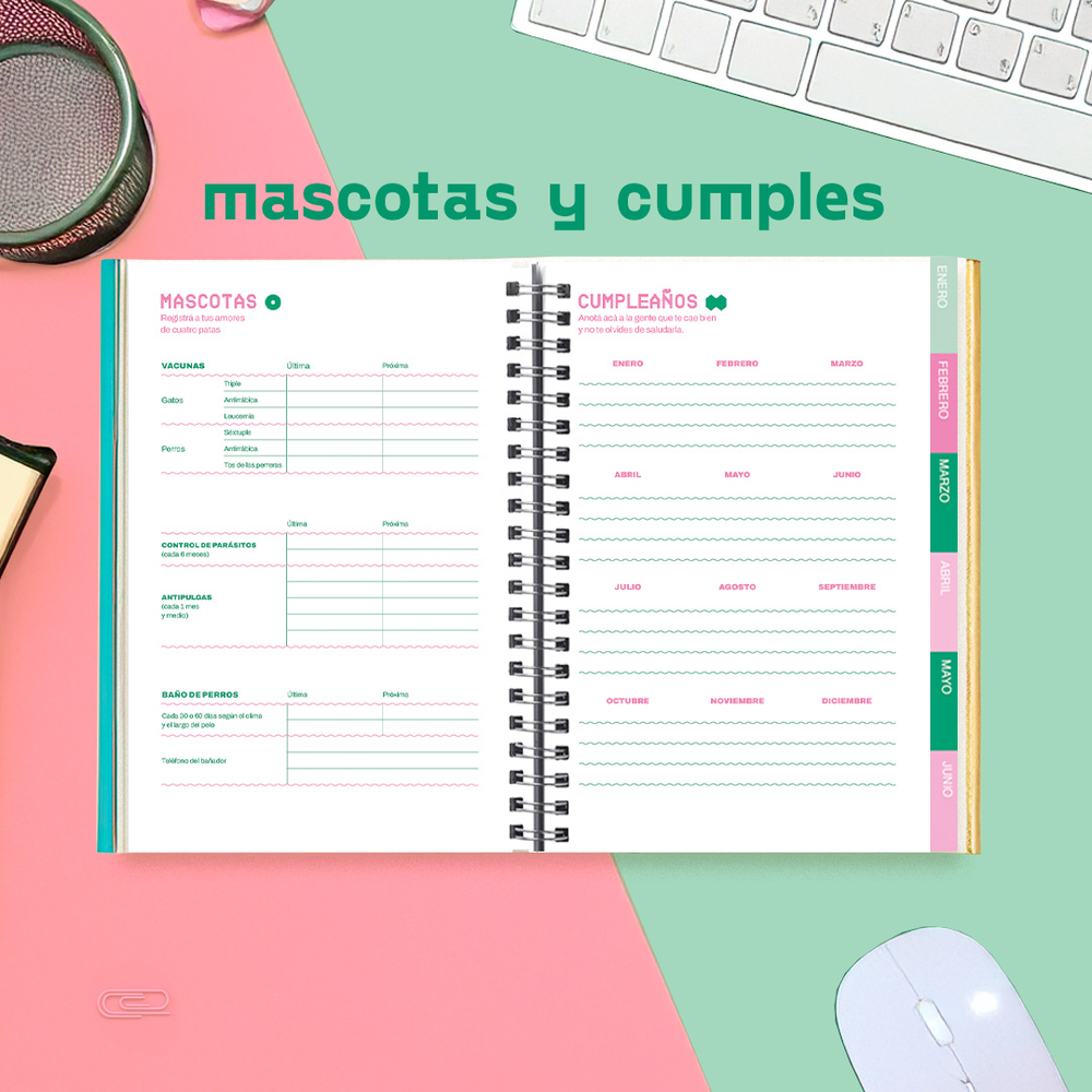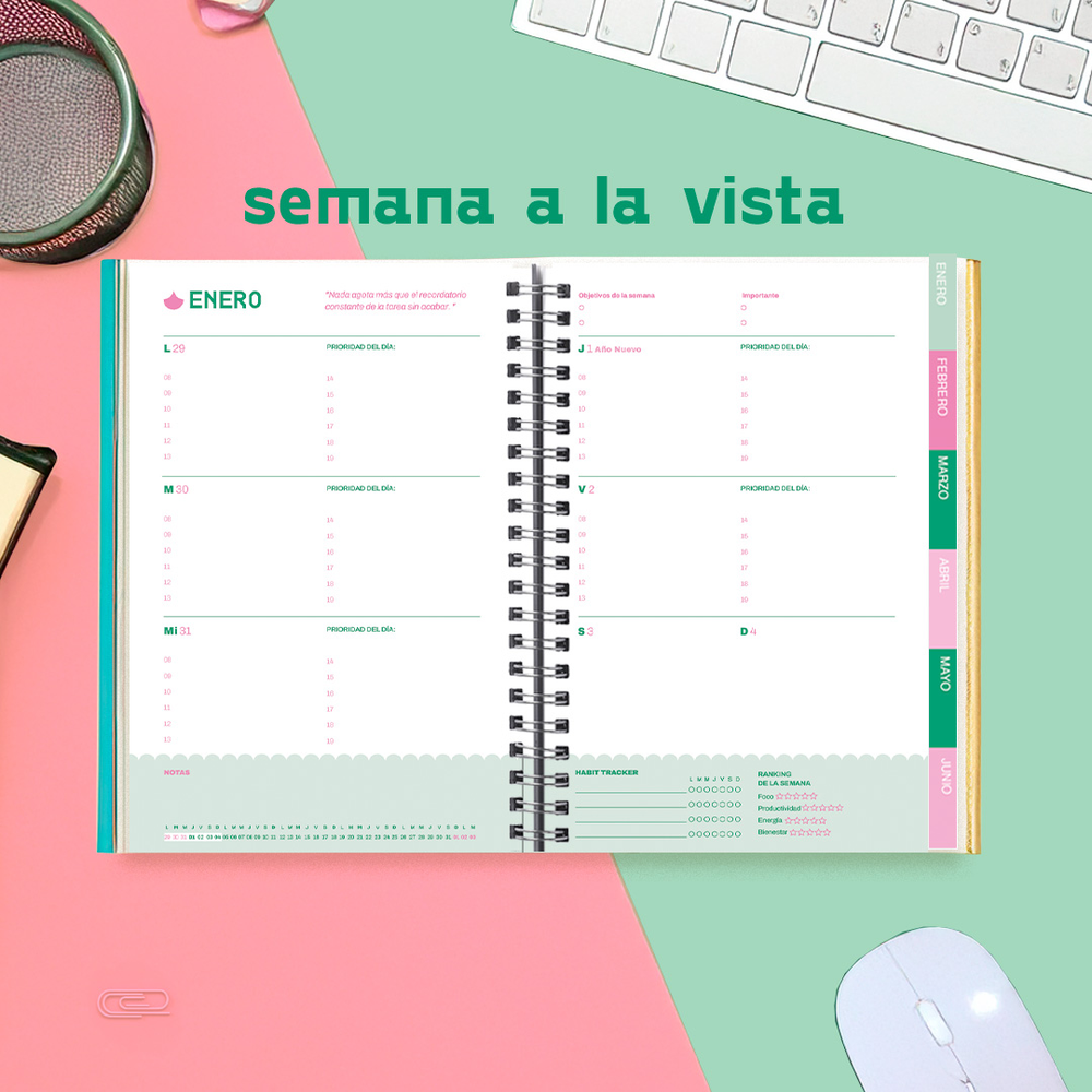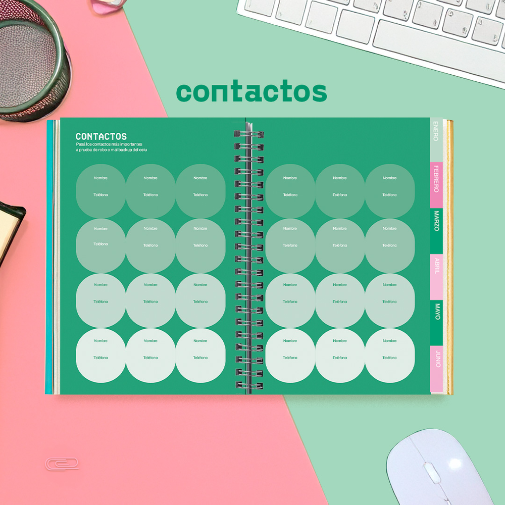 Encuadernación: Tapa dura (con hot stamping) y laminada, super resistente. Anillado y cierre elástico.