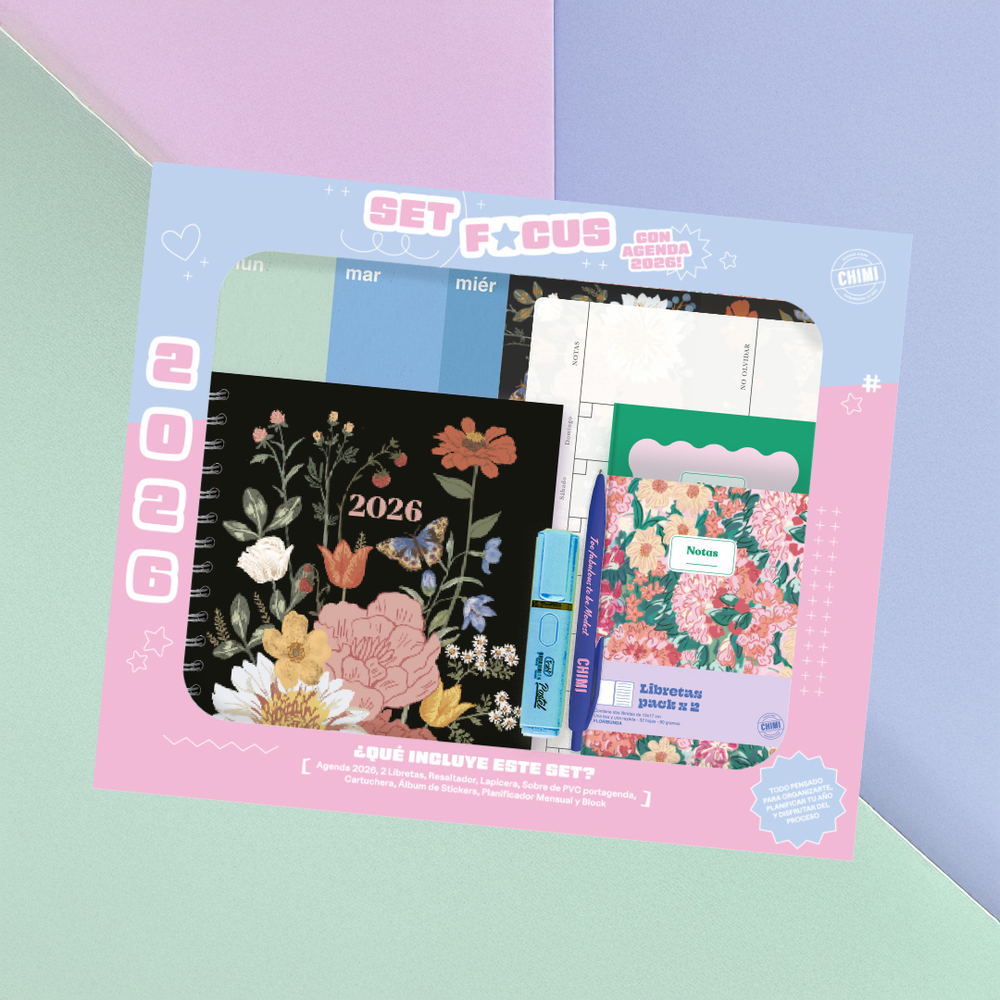✨ Set Focus ✨ Porque organizarse puede ser lindo y divertido 💛 Este set tiene todo lo que necesitás para poner tus ideas en orden y cumplir tus objetivos sin perder el estilo. Incluye: 📅 Agenda cuadrada semanal 📝 Planner de papel 🧲 Planner imantado para tener tus pendientes siempre a la vista (¡y pegado en la heladera si querés!). Con marcador 📒 Pack de libretas (52 paginas, una lisa y otra rayada) ✉ 1 Sobre pvc guarda tutti 👝 1 cartuchera 📒1 libreta de stickers ♥ 1 resaltador 🖊 1 lapicera 🥡 1 caja con ventana