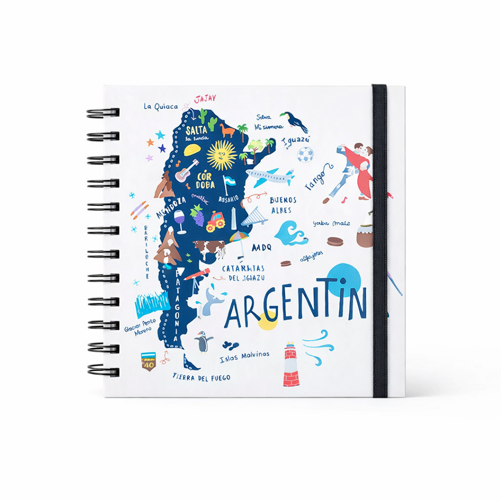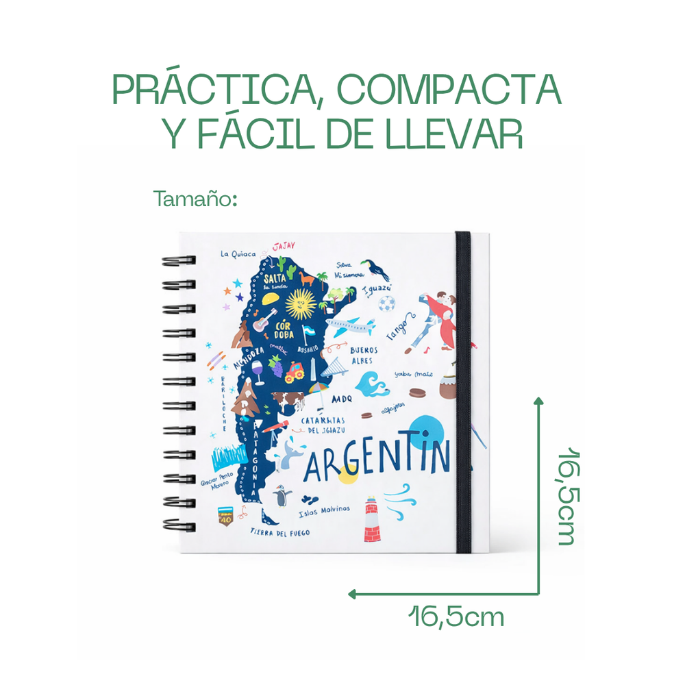 . Tamaño: 17 x 17 cm . Interior: 160 páginas. . Encuadernación: Tapa dura y laminada, super resistente. Anillado y cierre elástico. . Papel: Ahuesado de 80gr. . Trae sobre organizador