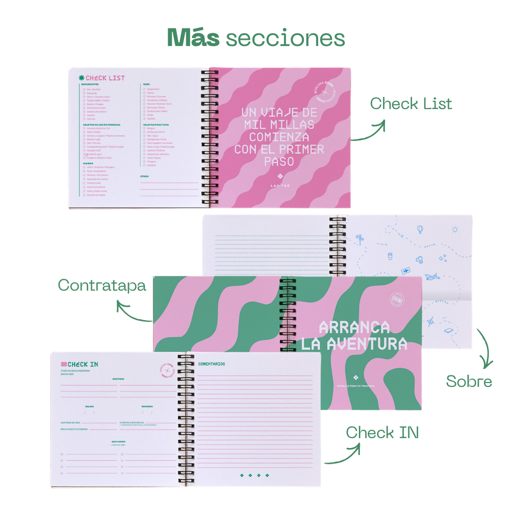 Bitácoras de viaje, ideal para organizar todas tus aventuras y usar como cuaderno para registrarlo todo. Las secciones que incluye son: Checklist / Planificador mensual / Planificador de destinos / Aplicaciones para viajes / Páginas de control de gastos / Mapas y frases inspiradoras y 80 páginas de notas. Con una misma bitácora podes organizar hasta 8 destinos, ideal para viajes largos a varios lugares.