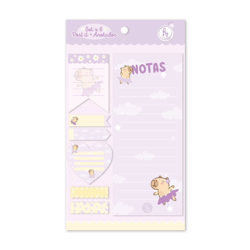 Set x 6 Post it de papel ilustrados. Anotador de 15 hojas rayadas En bolsa con cabezal!