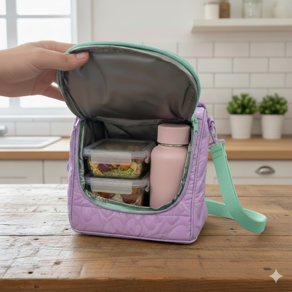 Lunchera térmica con diseño matelassé y apertura frontal para un acceso cómodo. Cuenta con cierre simple, manija superior y correa regulable para mayor practicidad en el uso diario. Ideal para conservar alimentos y bebidas por más tiempo.