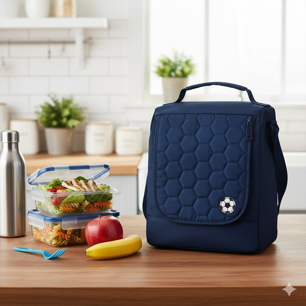 Lunchera térmica de tela con matelassé y apertura frontal para un acceso cómodo. Cuenta con cierre simple, manija superior y correa regulable para mayor practicidad en el uso diario. Ideal para conservar alimentos y bebidas por más tiempo.