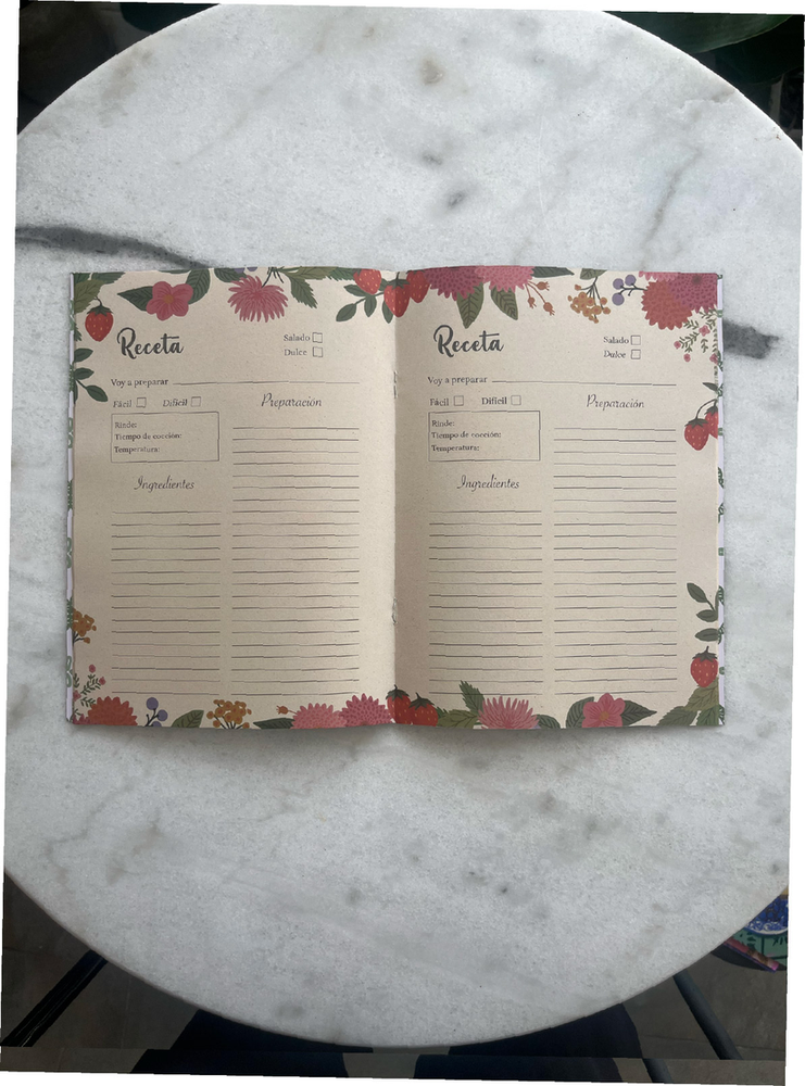 En su interior incluyen 38 páginas diseñadas para completar si la receta es dulce o salada, los ingredientes, cuánto rinde y el paso a paso de la preparación. Un formato práctico para escribir con comodidad y mantener todo ordenado.