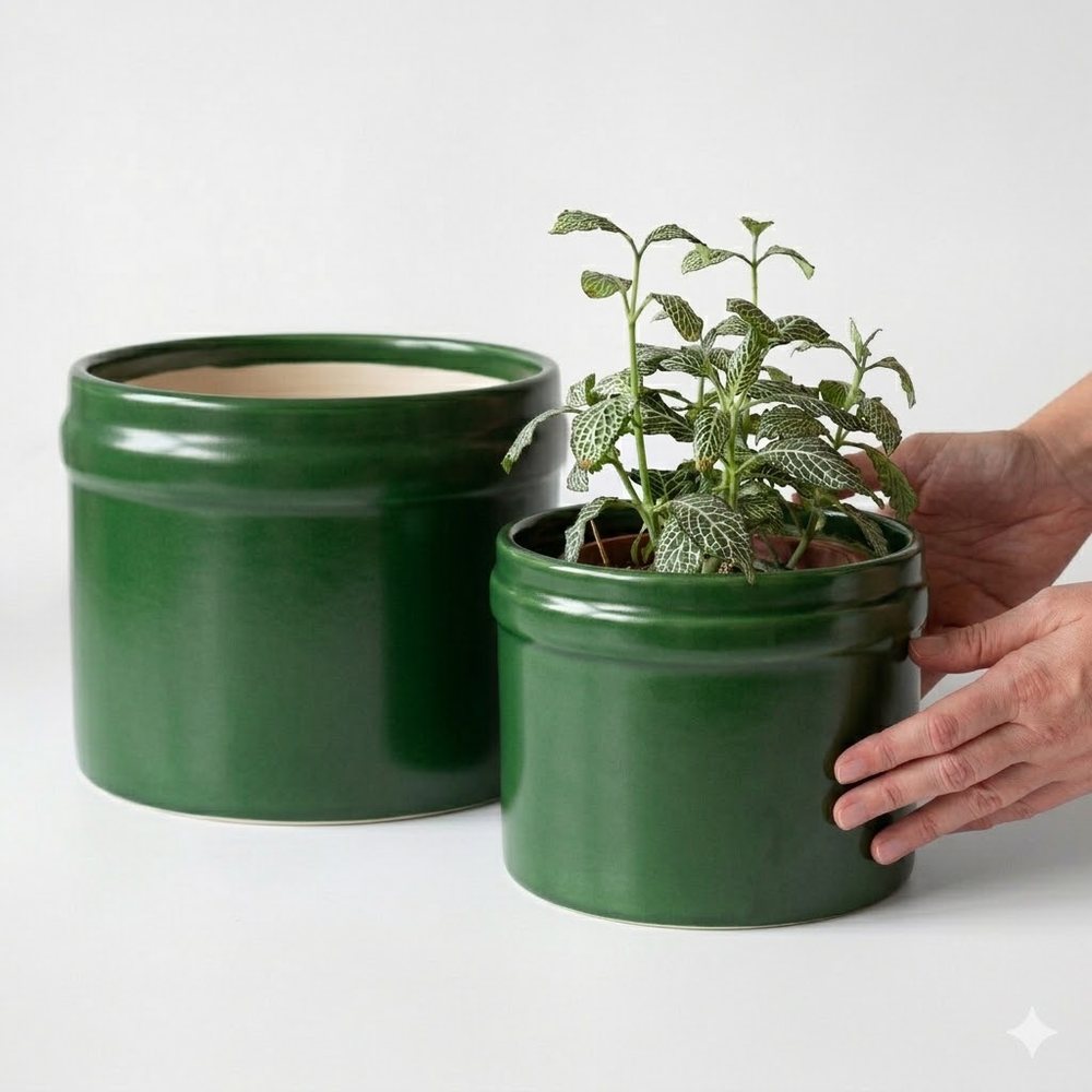 Macetas de cerámica esmaltada con terminación brillante, ideales para sumar un toque decorativo y funcional a cualquier espacio. Disponibles en dos tamaños para adaptarse a distintos tipos de plantas.